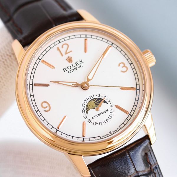 Best Edition With Swiss ETA2824-2 Movement Replica Rolex Geneve Cellini Yellow/Rose Gold with White Dial Black/Brown Italian Leather Band Watch