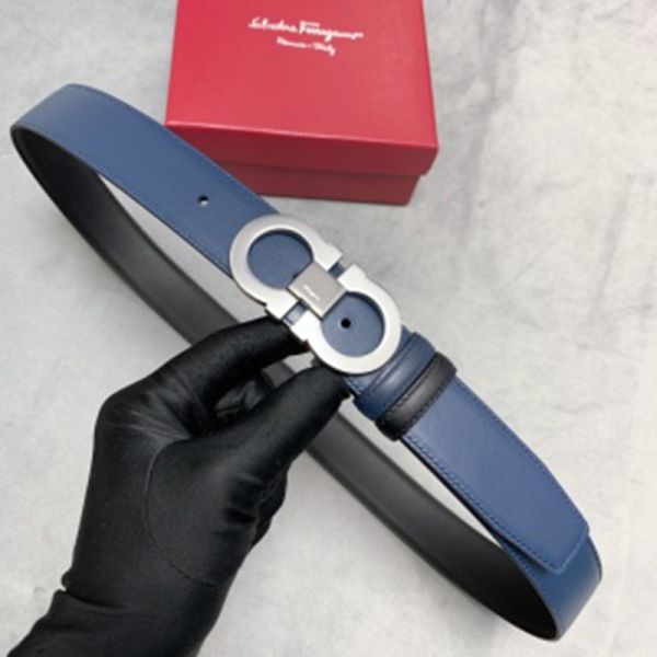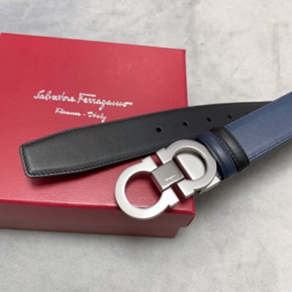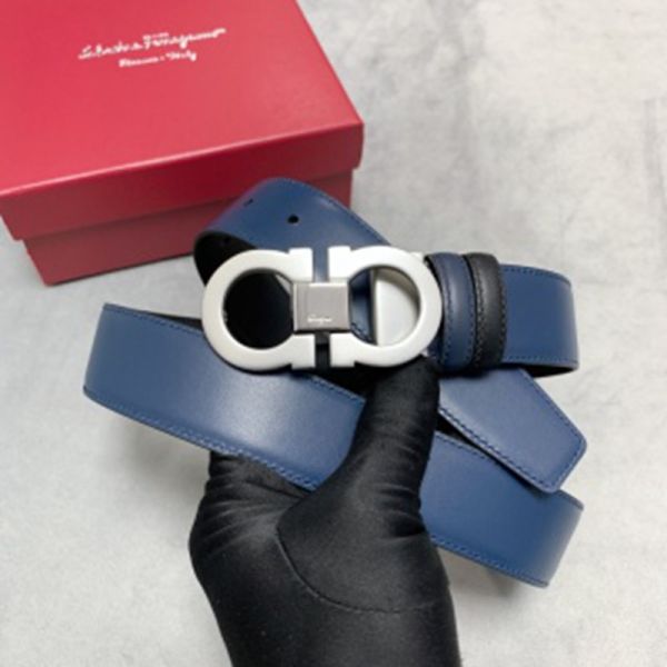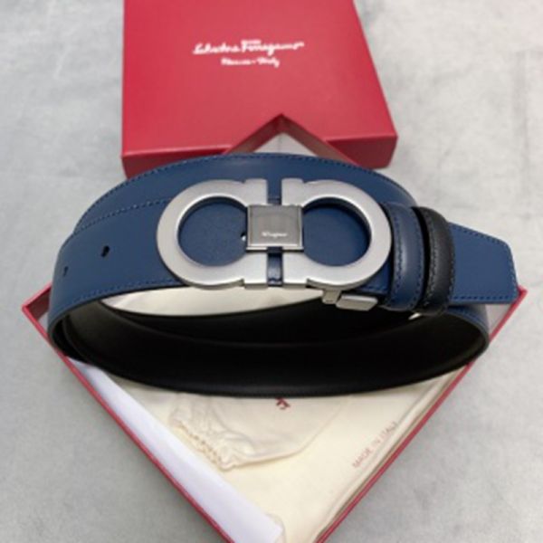 1:1 Ferragamo  Blue&Black Leather Belt  with Silver Logo buckle Plate  Buckle 3.5cm