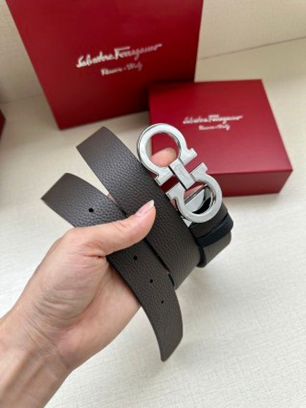1:1 Ferragamo  Chocolate&Black Leather Belt  Smooth with Silver Logo buckle  3.4cm