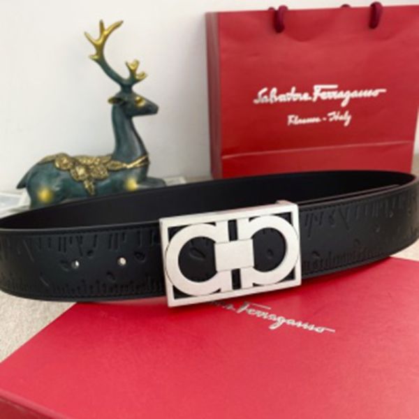 1:1 Ferragamo  Black Leather Belt  with Silver Logo buckle Square Buckle  3.8cm