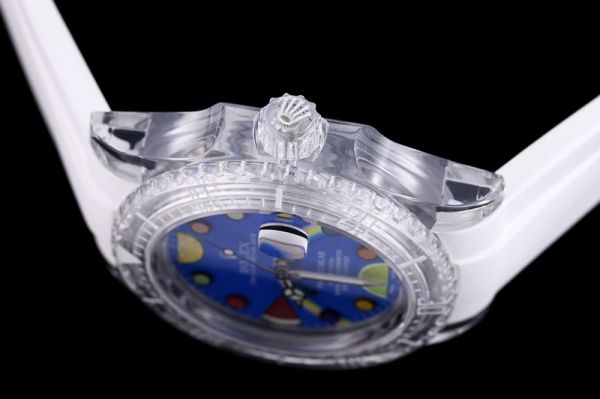 The dial features a playful blue cartoon style, with fun elements like watermelon and rainbow. The luminous hands and hour markers allow for easy time reading even at night.