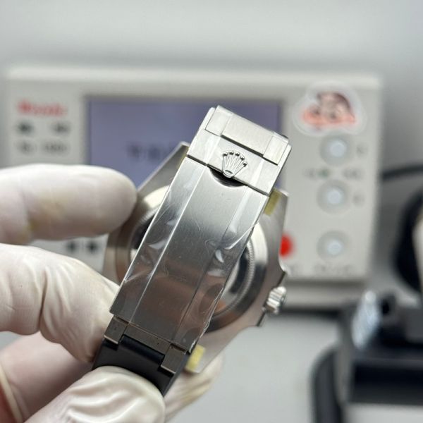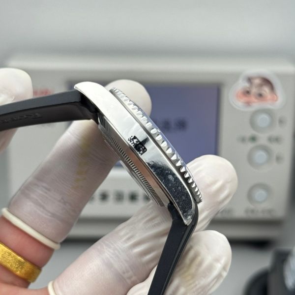 Rolex crown logo micro etched at 6 o'clock on the crystal.