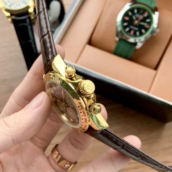 Rolex Daytona Ref. 116518, crafted from 18K yellow gold, features a 40mm case diameter, an automatic mechanical movement, and a leather strap that exudes superior texture.