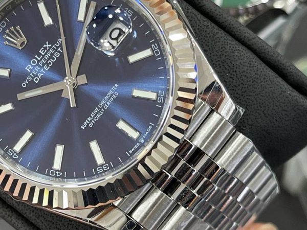 Rolex Datejust Ref. 126334 Blue Dial Watch, featuring a 41mm Oystersteel case, a five-piece link Jubilee bracelet, and a highly recognizable fluted bezel.