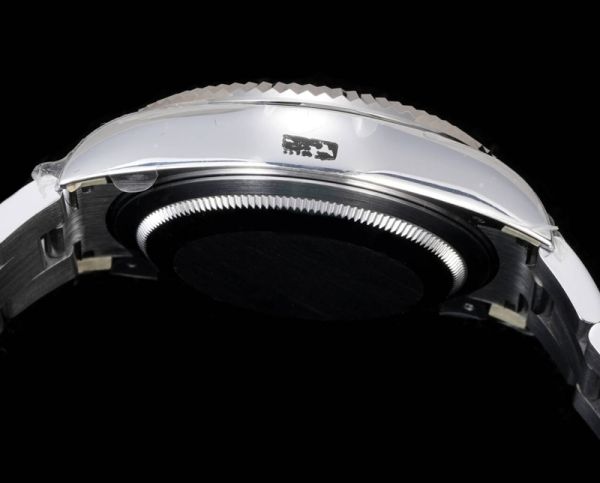 Rolex crown logo micro etched at 6 o'clock on the crystal.