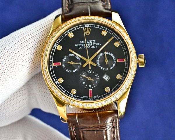 Best Edition With Imported 9100 Movement Replica Rolex Datejust White/Gold/Black Face Black/Brown Italian Calfskin Leather Band Watch
