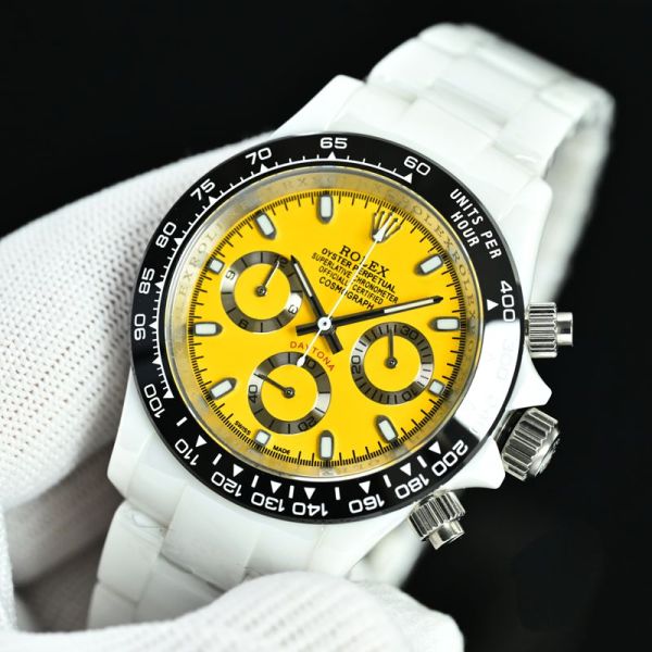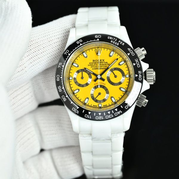 The white ceramic bracelet is paired with a highly saturated yellow dial, while the black bezel and silver chronograph buttons create a striking contrast. The overall design delivers a powerful visual impact, making it an iconic piece that perfectly blends sportiness and contemporary style.