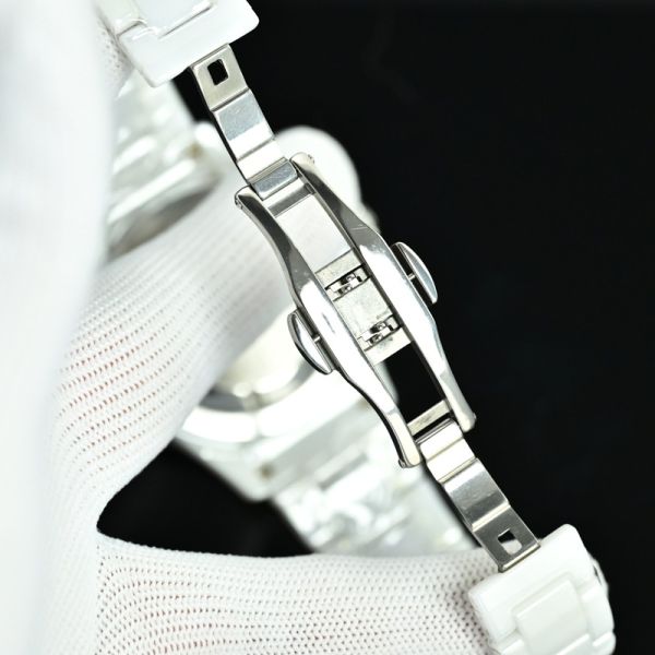 The Rolex Daytona watch features a rare combination of a pink dial with a white ceramic case and bracelet, complemented by a black ceramic bezel. Its overall design is both luxurious and distinctly individualistic.