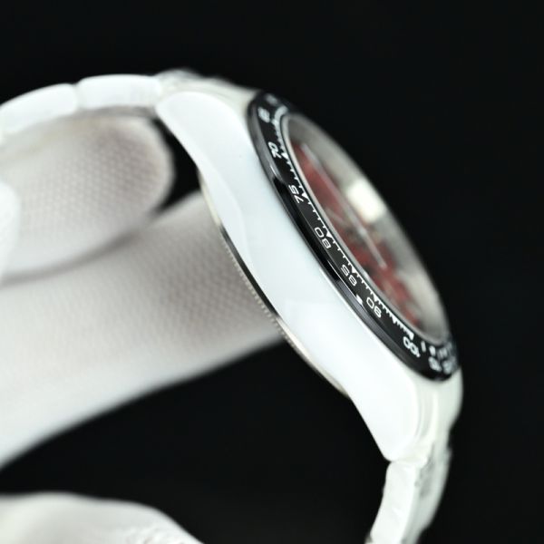 The Rolex Daytona, crafted with a white ceramic case and bracelet and paired with a visually striking red dial, is a choice for "advanced collectors" among classic chronographs.