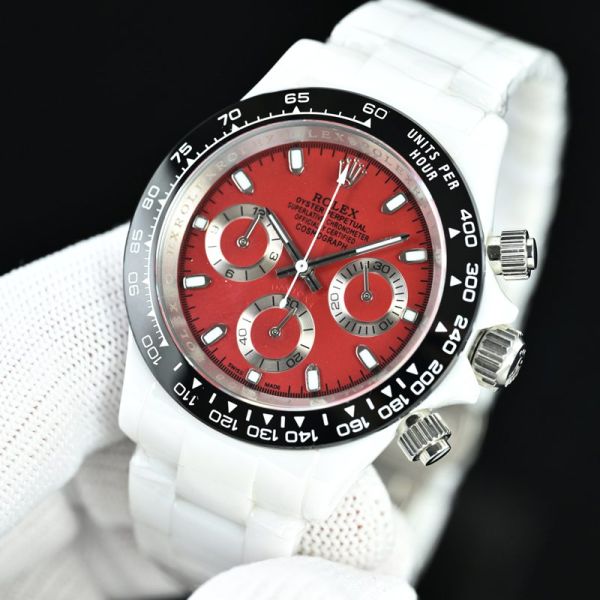 The Rolex Daytona, crafted with a white ceramic case and bracelet and paired with a visually striking red dial, is a choice for "advanced collectors" among classic chronographs.