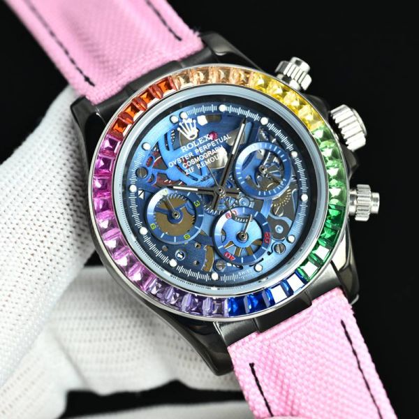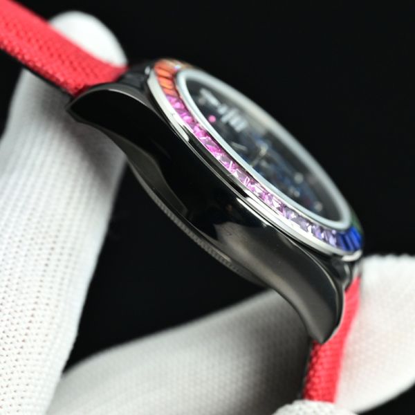 Rolex Cosmograph Daytona, featuring a bezel inlaid with rainbow-hued gemstones and paired with a pink fabric strap. Its bold and resplendent design exudes unrivaled personality and contemporary fashion flair.