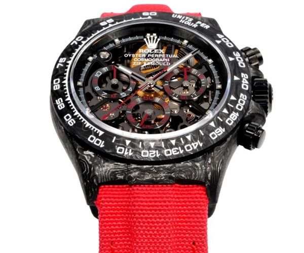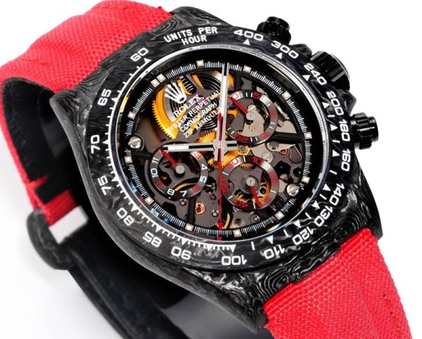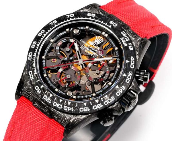 Best Edition With Dandong 4802 Automatic Movement Replica Rolex Daytona Carbon Fiber Case with Black Skeleton Face Red Fabric Band Watch