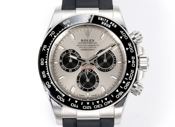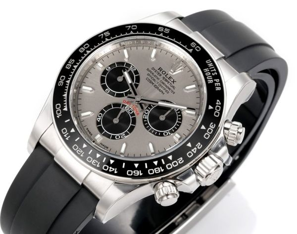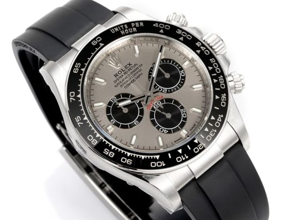 Rolex Daytona 904L Steel 40mm Ceramic Bezel Platinum Markers Grey Face Oysterflex Band Watch