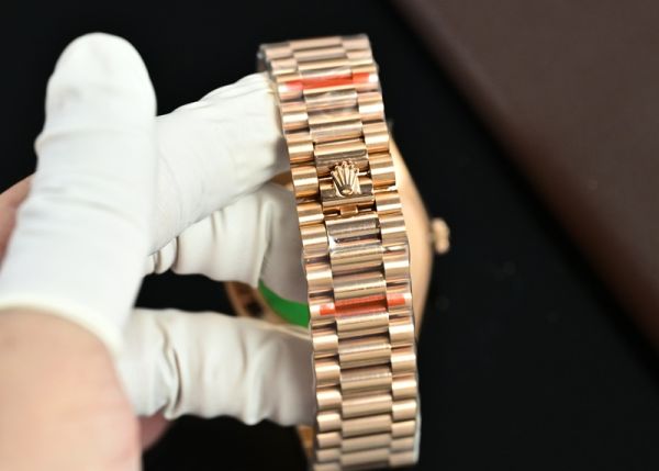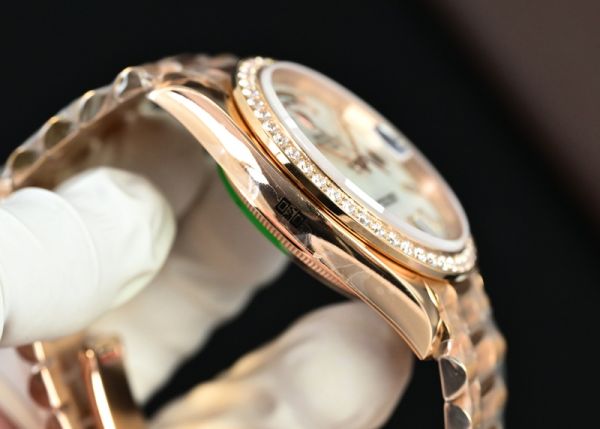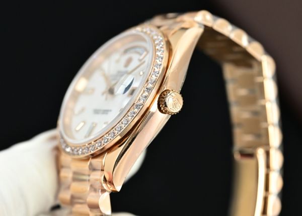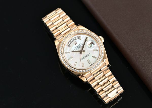 The rose gold diamond-set watch from the Rolex Daydate collection features a mother-of-pearl dial, complemented by diamond hour markers and a diamond-set bezel. Its overall design is luxurious and elegant, striking a perfect blend of classic charm and contemporary style.