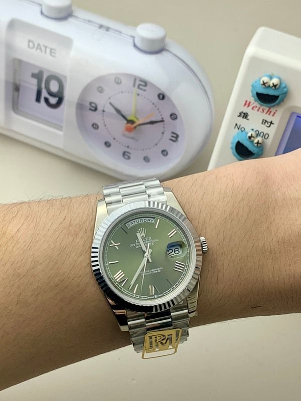The Rolex Day-Date watch features a classic olive green dial with silver Roman numeral hour markers, paired with a SS case and bracelet crafted from stainless steel. Its overall design is elegant and highly distinctive.