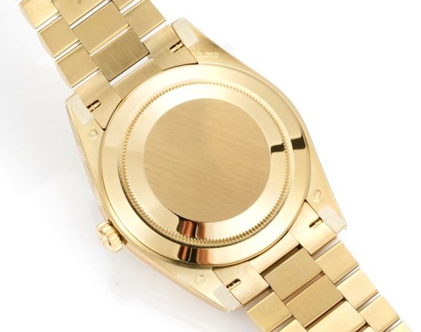 Rolex Day‑Date 118238 solid gold watch, with the case and bracelet both crafted from 18K yellow gold. It features a gold dial with Roman numeral hour markers, exuding full luxury.