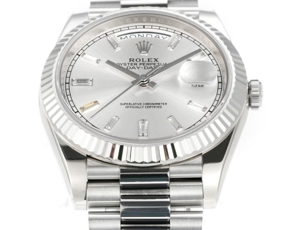 Oystersteel case + President bracelet, silver dial with baton hour markers, and a classic fluted bezel