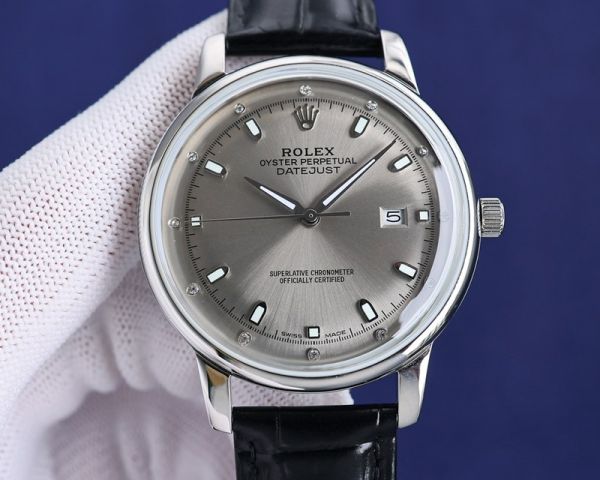 This Rolex Datejust watch features a classic 42mm case made of stainless steel, paired with a black calfskin strap, striking a perfect balance between elegance and durability. The silver-gray dial is adorned with diamond hour markers, and the date window at the 3 o'clock position makes it both practical and exquisite.
