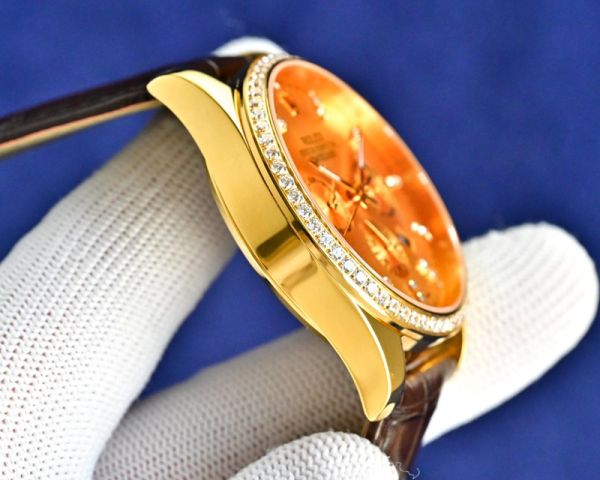 A silver dial paired with diamond hour markers and a diamond-set bezel, matched with a black imported cowhide strap. The overall design is elegant and luxurious, perfectly blending classic charm with modern style.