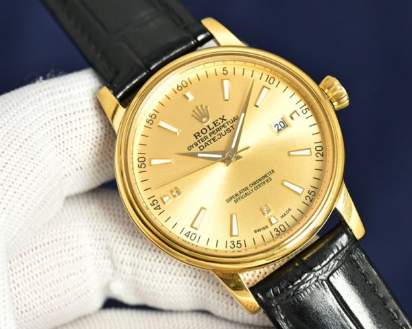 The 18K yellow gold Rolex Datejust features a solid 18K yellow gold case and dial, paired with a black calf leather strap. Its design is elegant and refined, striking a perfect balance between luxury and practicality for everyday wear.