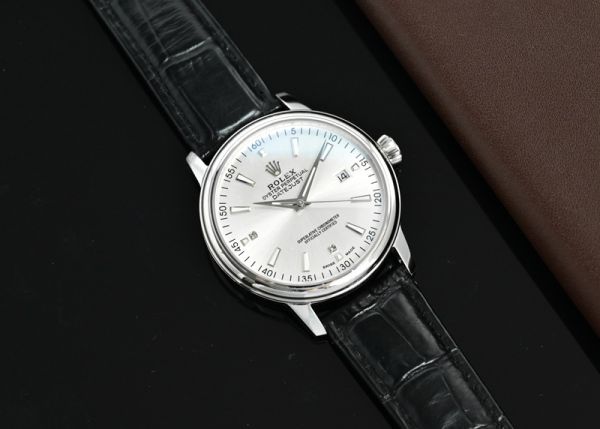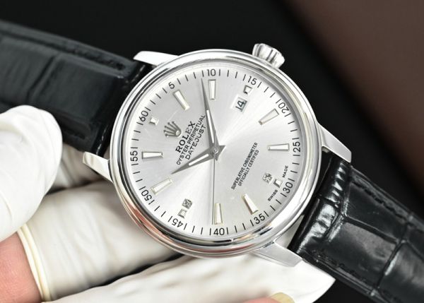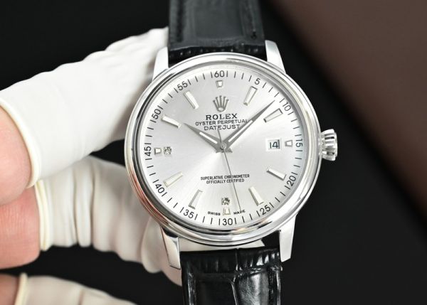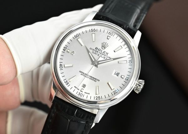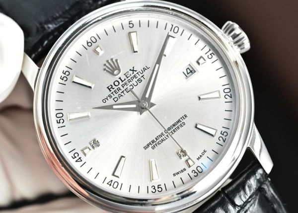 Rolex Datejust watch, featuring a silver dial paired with a black calfskin strap, exudes an understated elegance that is both sleek and luxuriously textured.