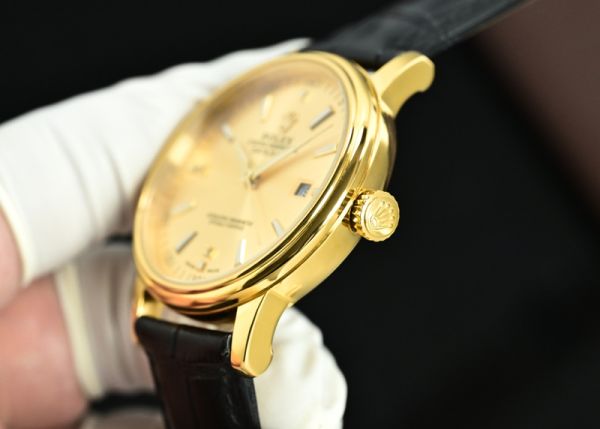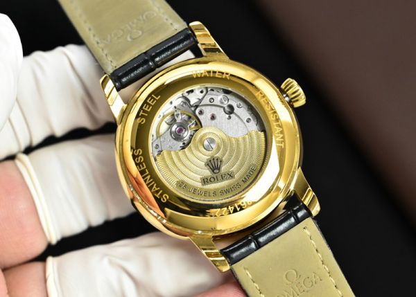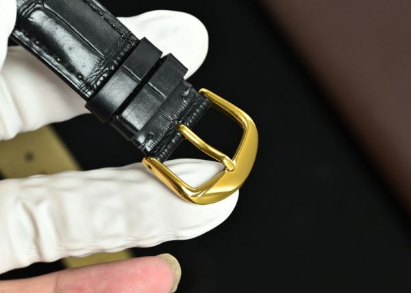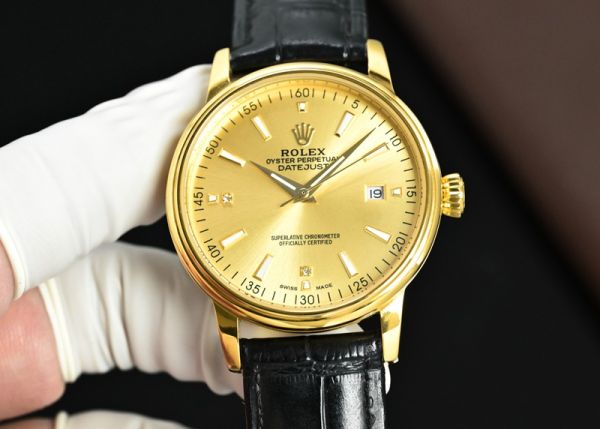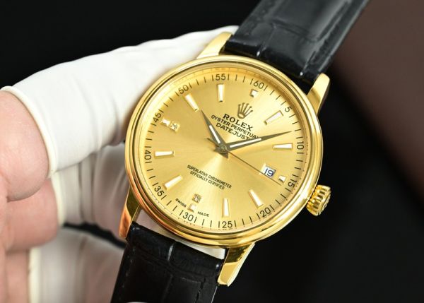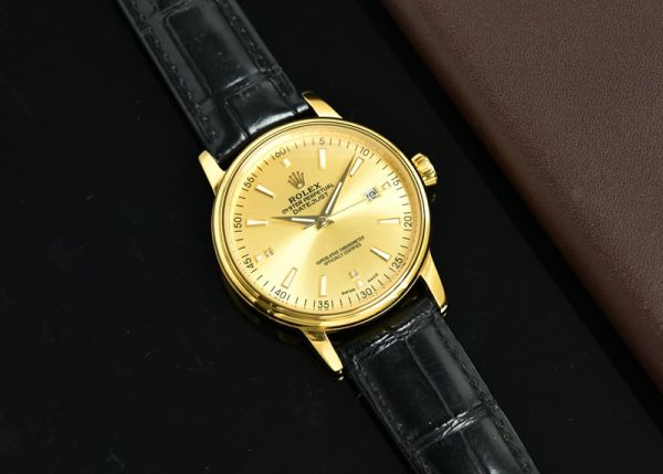 This Rolex yellow gold watch features an 18K yellow gold case and dial, paired with a black calfskin strap. Its minimalist and elegant design exudes understated luxury.
