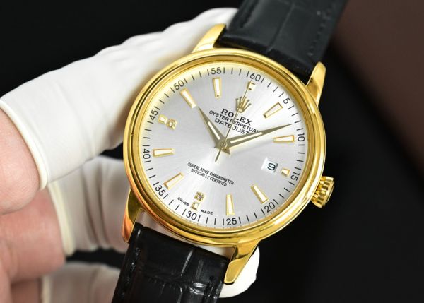 The Rolex Datejust in yellow gold features an 18K yellow gold case, complemented by a silver sunray dial and a black calfskin strap. Its overall design is elegant and sophisticated, striking a perfect balance between luxury and practicality for everyday wear.