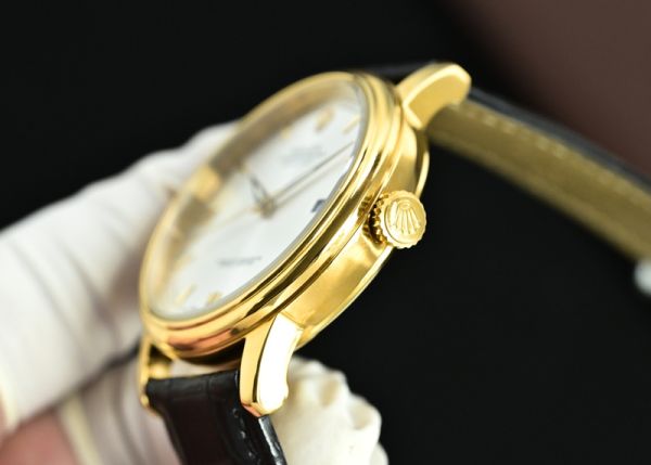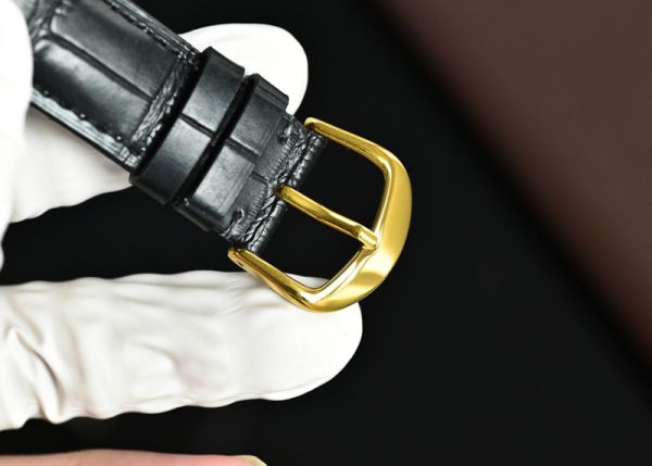 This Rolex yellow gold watch boasts an 18K yellow gold case and dial, paired with a black calfskin strap. Its clean and sophisticated design exudes an air of understated luxury.