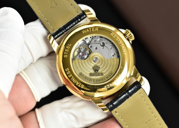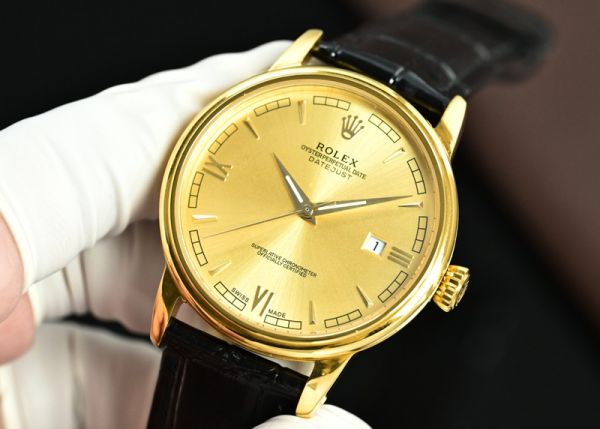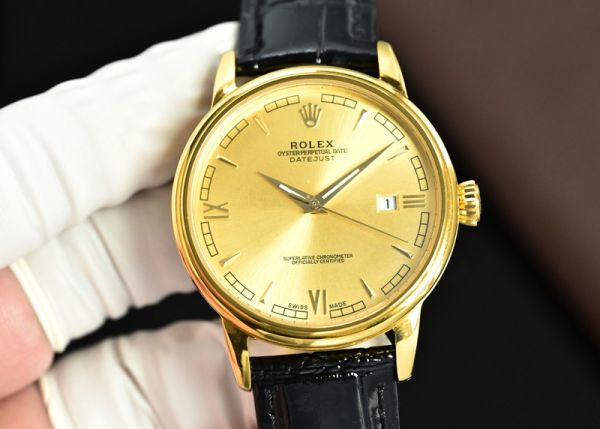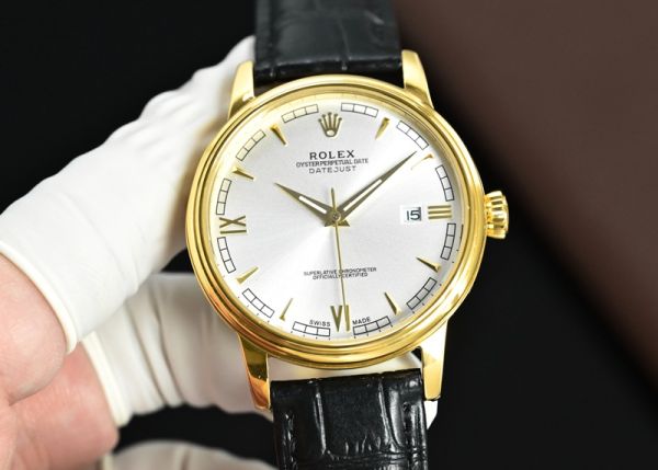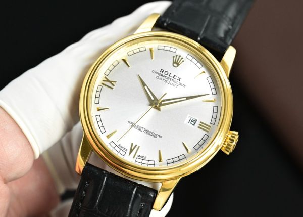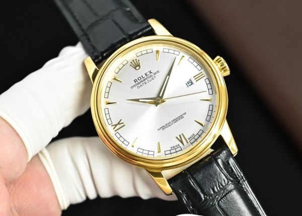 This Rolex yellow gold watch is paired with a black calfskin strap and features a silver-white dial with hour markers combining Roman numerals and baton indices. Its overall design is elegant and striking, with strong recognizability.