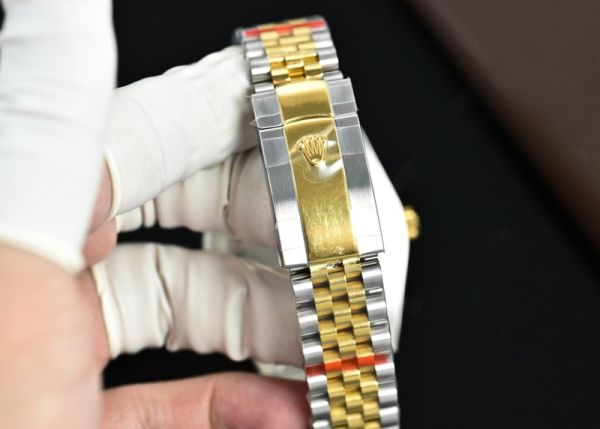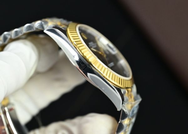 The Rolex Datejust two-tone watch features an iconic two-tone design of stainless steel and 18K yellow gold, complemented by a dark grey dial with Roman numeral hour markers. It exudes an elegant temperament and boasts strong recognizability.