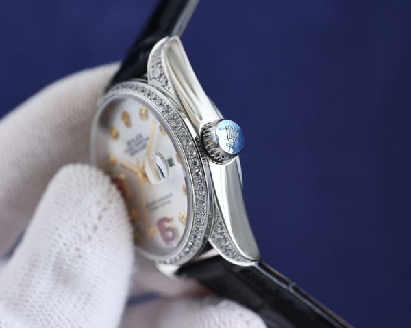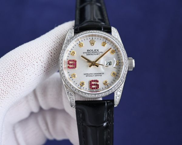 Rolex Datejust for women, featuring a rose gold case, a white mother-of-pearl dial, and a diamond-set design that exudes sheer luxury! Both the hour indices and the bezel are encrusted with diamonds, with a date display at the 3 o'clock position.