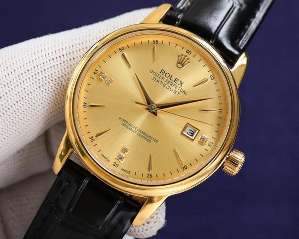 Rolex Datejust Series: Classic gold-plated case with a silvery-white dial, gold indices and hands, and a date window at 3 o’clock, simple and stylish.