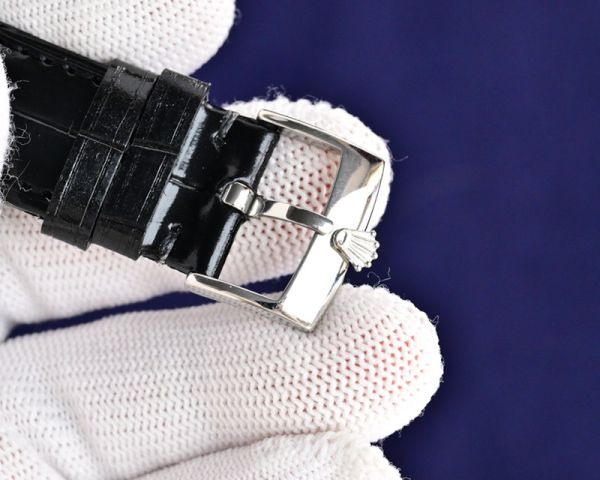 White dial with Roman numeral markers and a black leather strap, elegant and timeless.