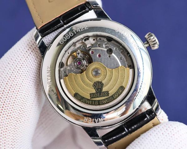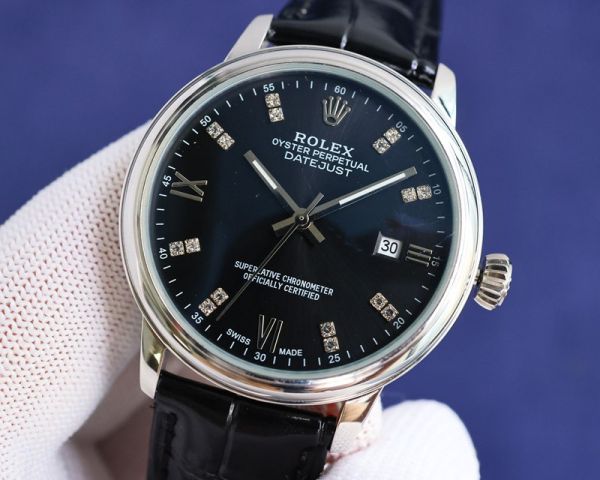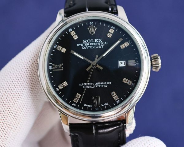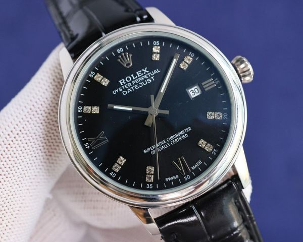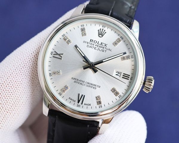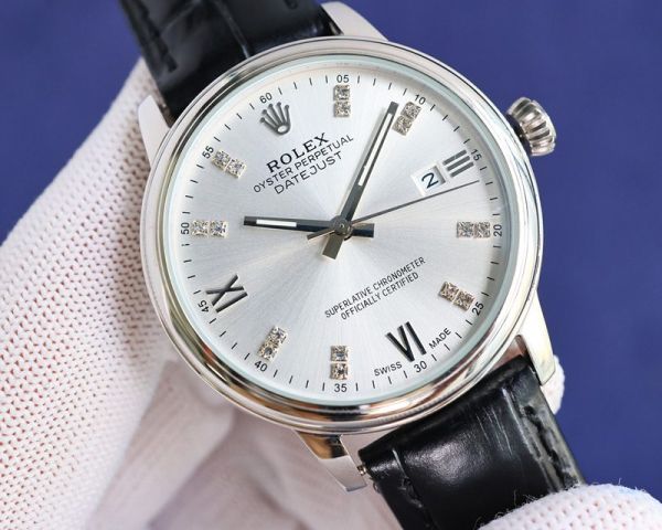 Rolex Datejust Watch, equipped with a classic automatic mechanical movement for precise timekeeping. It features a silvery-white dial with Roman numeral hour markers and a date display at the 3 o’clock position, practical yet elegant.
