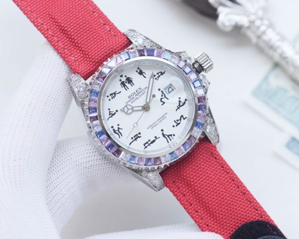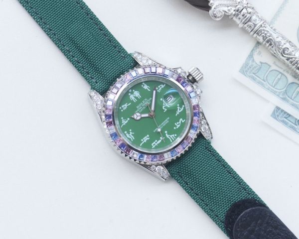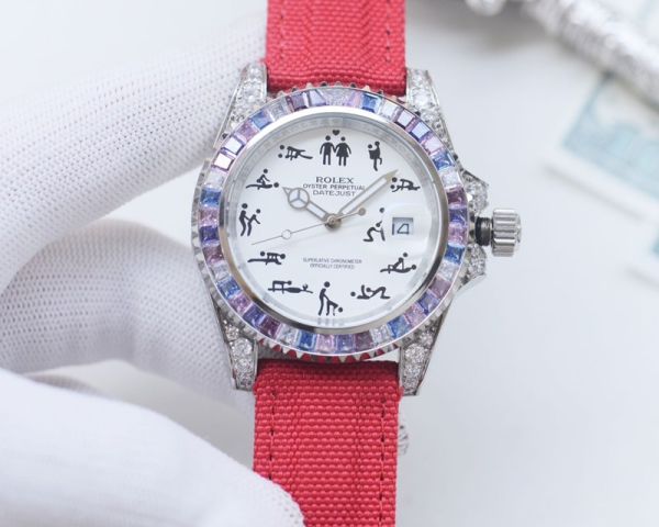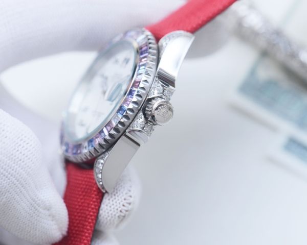 Best Edition With 9015 Movement Replica Rolex Datejust White Gold with Green/White Dial Green/Red Fabric Band Watch