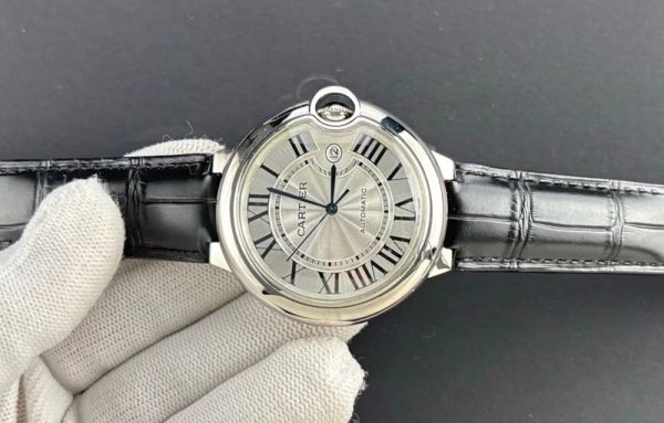 Cartier Ballon Bleu WSBB0030, 42mm steel case with black alligator leather strap, featuring a silver flinqué dial and blued-steel hands, exuding understated elegance.