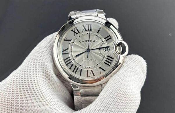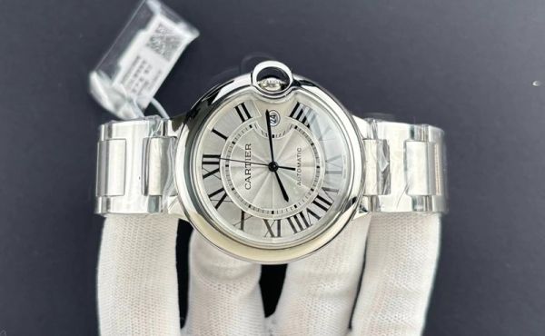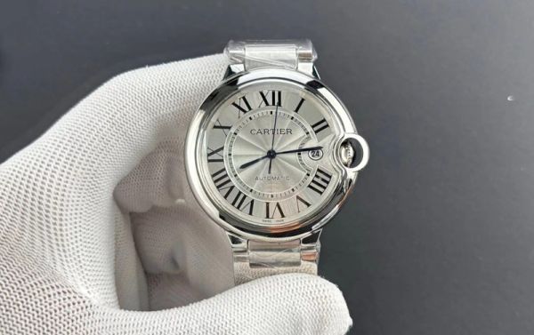 Cartier Ballon Bleu 42mm watch, crafted from stainless steel, features a silvered flinqué dial with Roman numeral hour markers that exude premium texture.