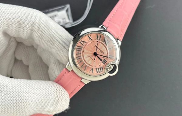 Cartier Ballon Bleu Collection WSBB0031, 33mm pink sunburst dial, automatic mechanical movement, stainless steel case paired with a pink alligator leather strap, exuding a delightful sense of youthful charm.