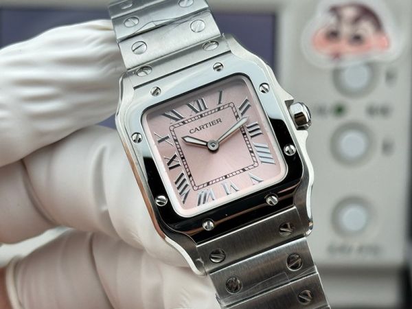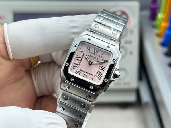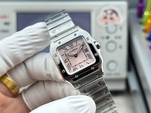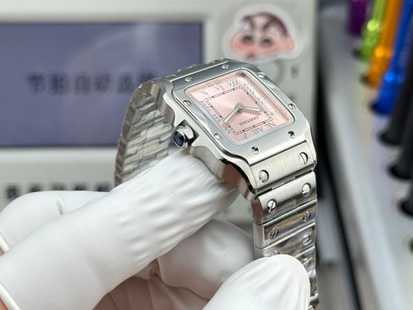 Best Edition With Imported Swiss Quartz Movement Replica Cartier Santos Pink Face White Gold SS Strap Lady Watch