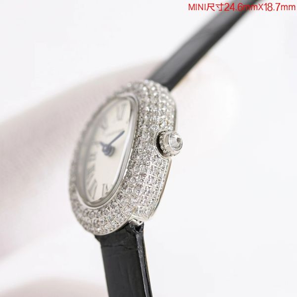 Best Edition With Japan Quartz Movement Replica Cartier Baignoire White Gold with White Face Black Leather Strap Lady Watch
