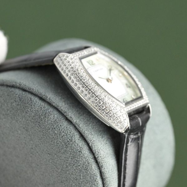 The tonneau-shaped case adorned with full diamond pavé exudes ultimate luxury! The cream dial paired with Roman numeral hour markers strikes a perfect balance of vintage charm and elegance.