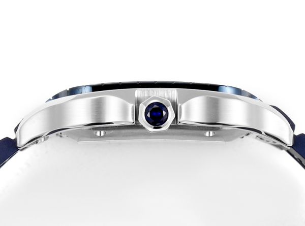 Cartier Santos Collection Watch, featuring a stainless steel case, a blue rubber strap and a 39.8mm dial.