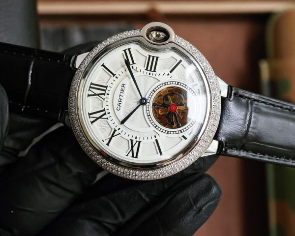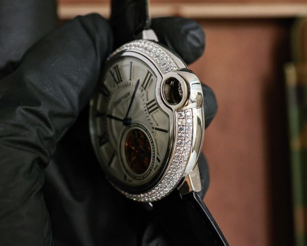 Cartier Ballon Bleu de Cartier Tourbillon Watch, with an approximate case diameter of 43mm, sapphire crystal glass, and a diamond-set bezel that exudes ultimate luxury.