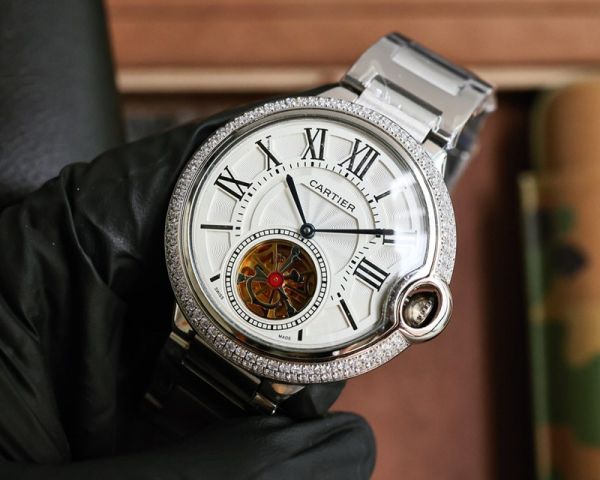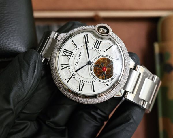 Cartier Ballon Bleu de Cartier Tourbillon Watch, 43mm dial, crafted from stainless steel with diamond inlays for an opulent touch. The dial features a CD-patterned white diamond finish and sword-shaped hands, paired with a tourbillon complication at the 6 o’clock position, showcasing striking mechanical elegance.