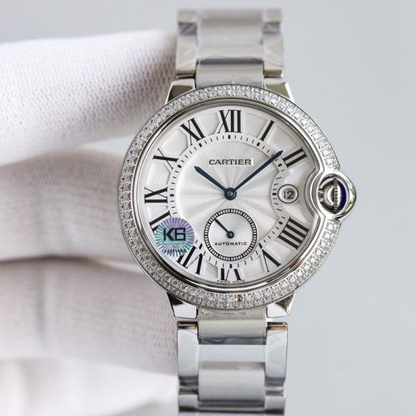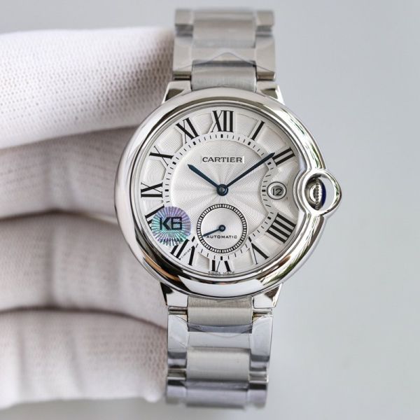 Cartier Ballon Bleu de Cartier watch, 42mm case diameter, crafted from stainless steel, equipped with an automatic mechanical movement, featuring a sapphire crystal glass, blued steel hands and Roman numeral hour markers, and presenting a sleek and elegant style.