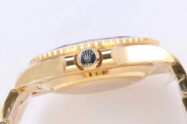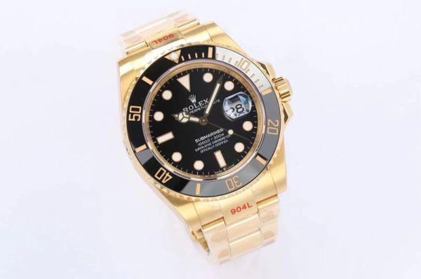 Rolex Submariner in yellow gold, featuring a classic black dial paired with a yellow gold case and bracelet, a black ceramic bezel with clear markings, and an overall design that blends luxury with sporty style.