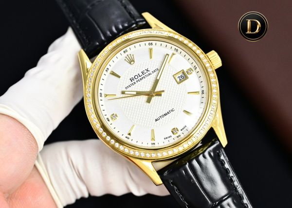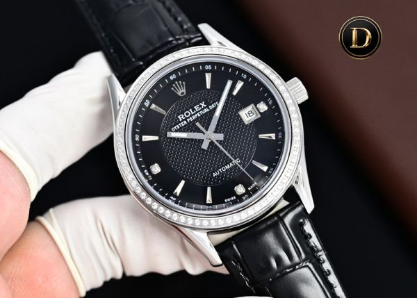 Rolex Oyster Perpetual Watch, featuring a 316L stainless steel case and a black calfskin strap. The scratch-resistant sapphire crystal glass and diamond-set bezel add to its premium appeal.