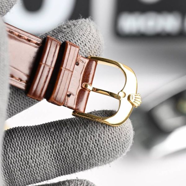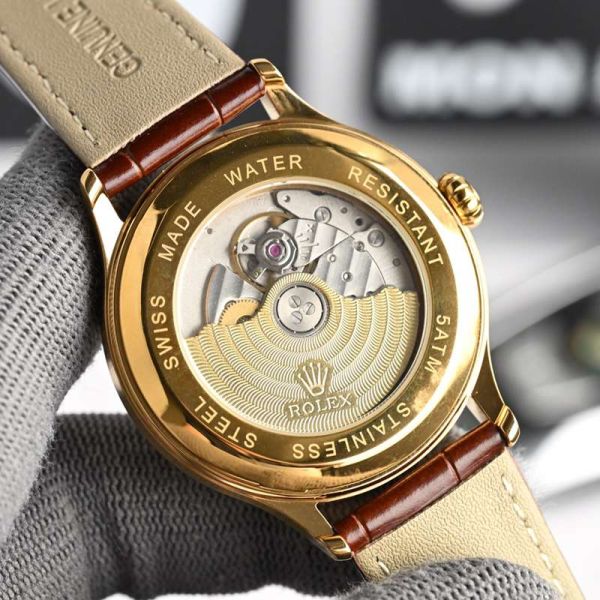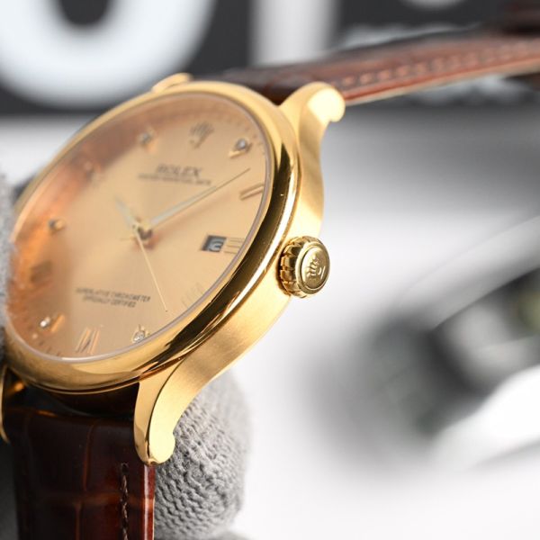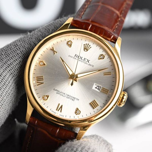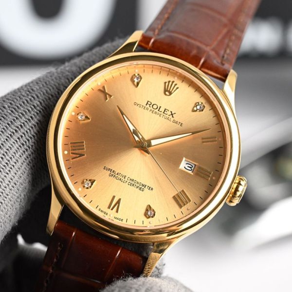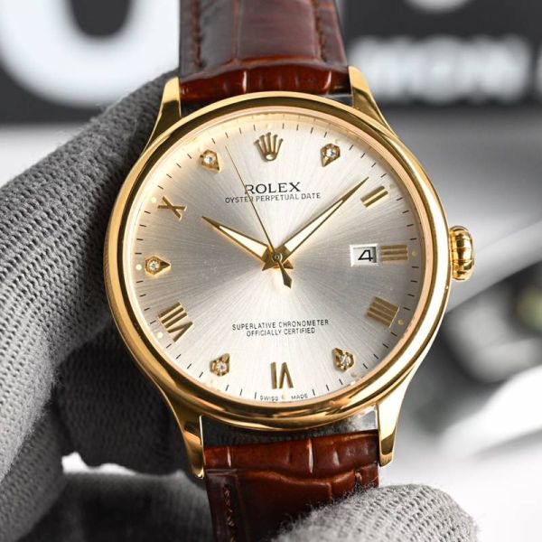 Best Edition With 9015 Movement Replica Rolex Oyster Perpetual Date Yellow Gold with White/Gold Dial Brown Italian Leather Band Watch