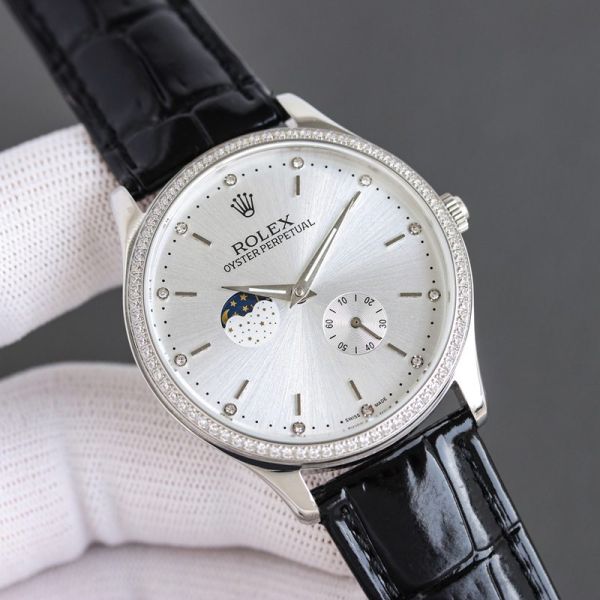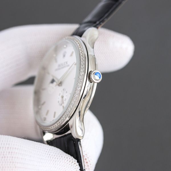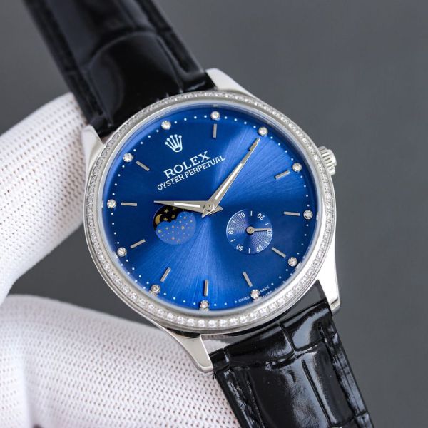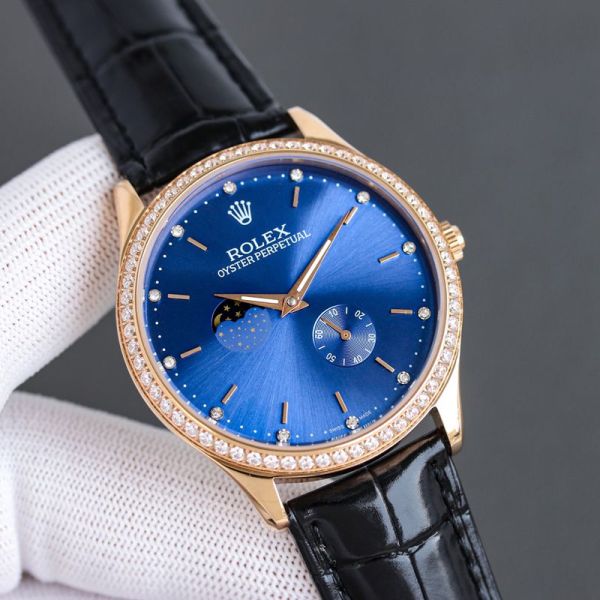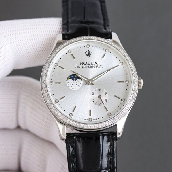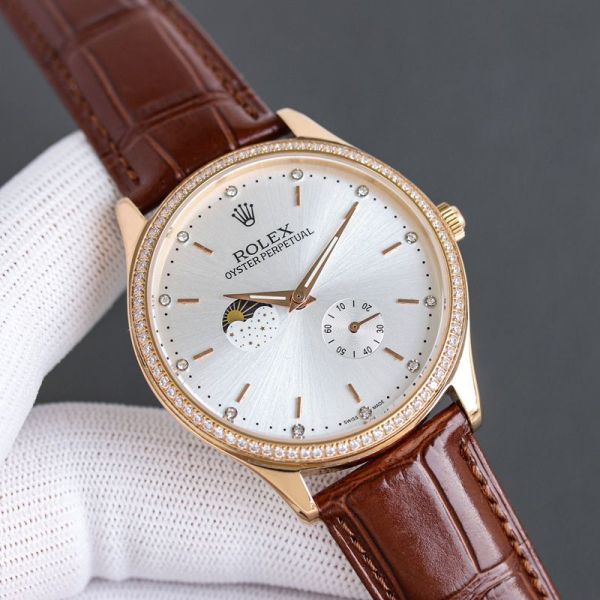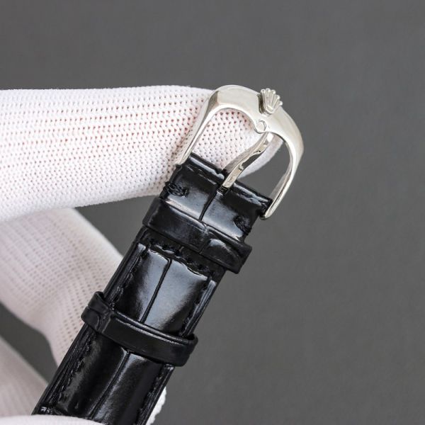 Best Edition With 82S7 Movement Replica Rolex Oyster Perpetual White/Rose Gold with White/Blue Dial Black/Brown Cowhide Band Watch
