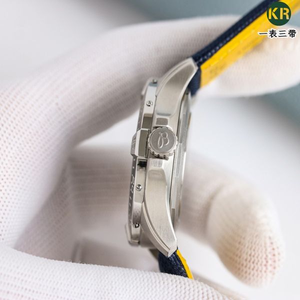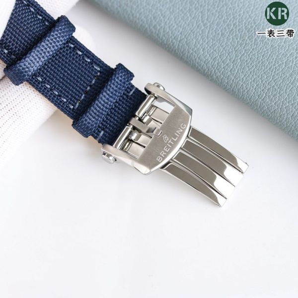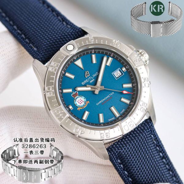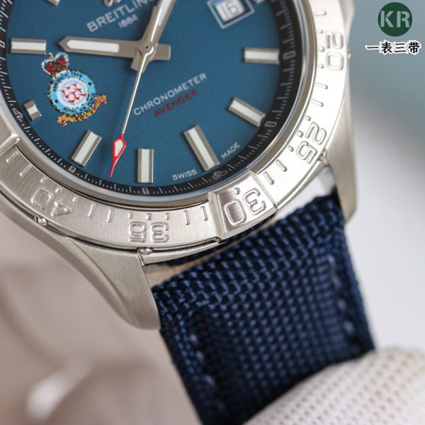 Breitling Avenger Series, 42mm stainless steel case with a blue dial, paired with a military-style fabric strap, rugged yet stylish!
